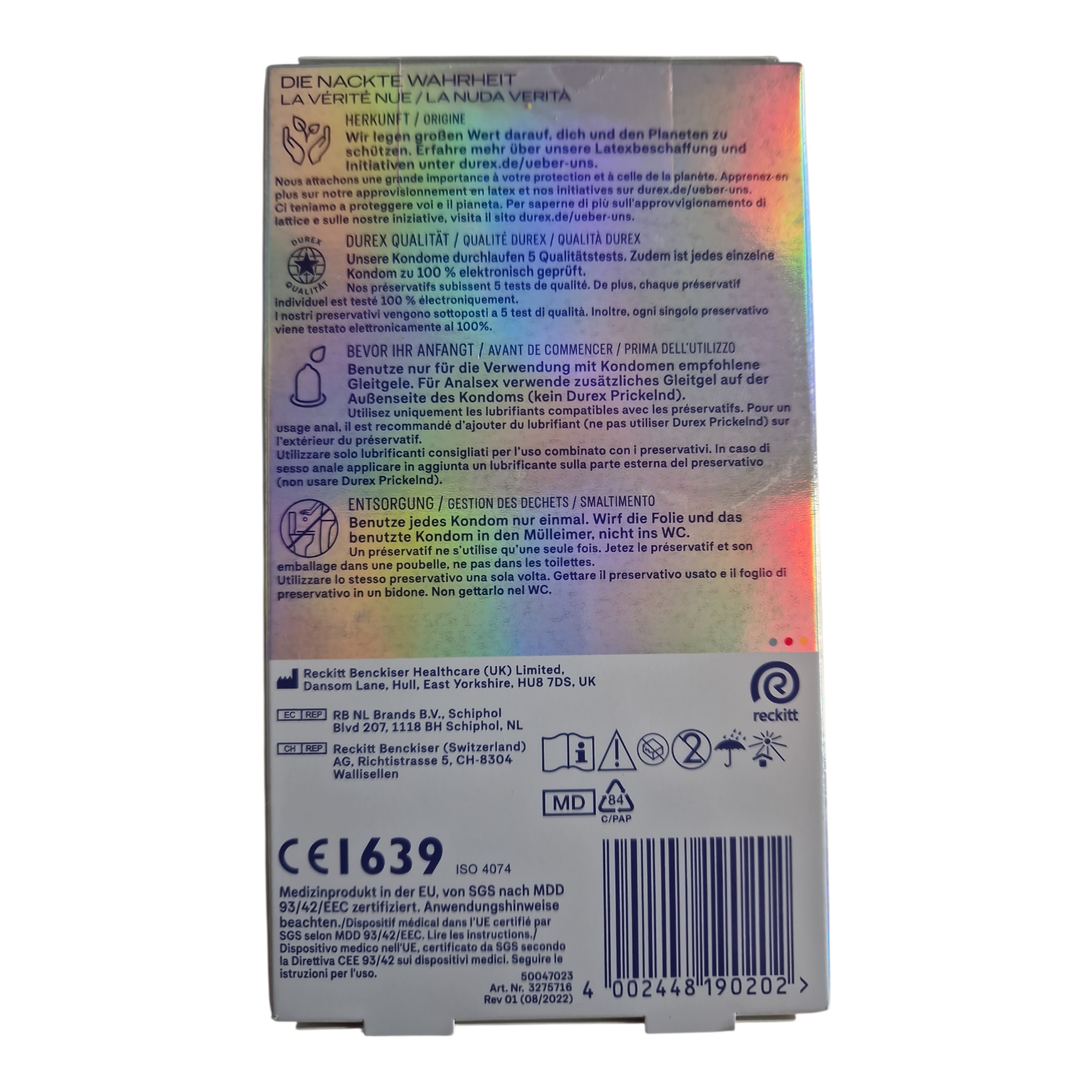 Die Anwendungshinweise auf der Packung vor der Verwendung sorgfältig durchlesen. Folie beim Öffnen mit dem Durex Logo nach unten halten, damit das Kondom richtig herum entnommen wird. Nur Gleitmittel verwenden, die für die Verwendung mit Kondomen empfohlen werden. Ein Kondom nie mehrmals verwenden. Nach Gebrauch das Kondom im Mülleimer entsorgen, nicht im WC.
